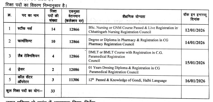 Bijapur Health Department Vacancy 2026 : छत्तीसगढ़ राज्य के बीजापुर जिले में स्वास्थ्य विभाग अंतर्गत संचालित स्वास्थ्य संस्थानों में स्वास्थ्य सेवाओं से सुचारु रूप से संचालन हेतु स्टाफ नर्स फार्मासिस्ट लैब टेक्नीशियन रिसर्च एवं कॉल सेंटर ऑपरेटर के लिए इंटरव्यू के लिए नोटिस जारी हुआ है यह कार्यालय मुख्य चिकित्सा एवं स्वास्थ्य अधिकारी जिला बीजापुर में उपस्थित होकर के आवेदन फॉर्म भर सकते हैं अधिक जानकारी के लिए बीजापुर के ऑफिसियल वेबसाइट पर विजित कर सकते हैं
